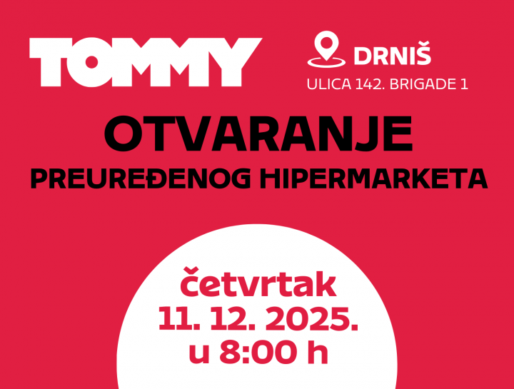 Tommy je najavio otvaranje preuređenog hipermarketa u Drnišu, smještenog u Ulici 142. brigade 1. Svečano otvorenje održat će se u danas, 11. prosinca 2025., u 8:00 sati.