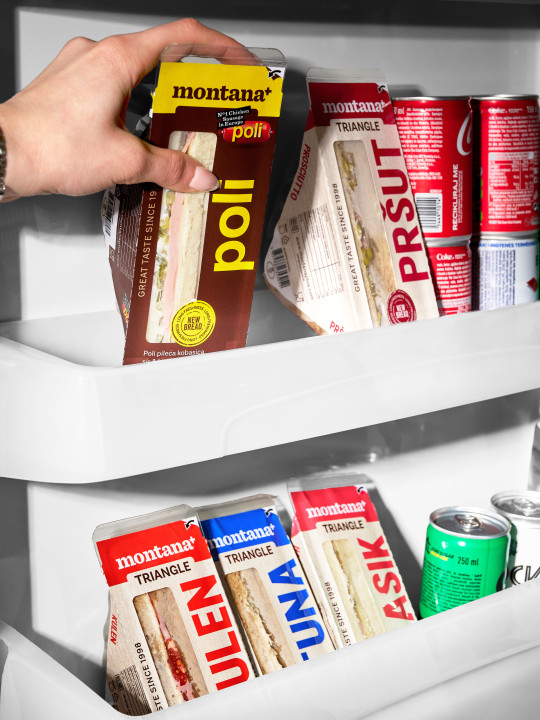 Legendarni hrvatski sendviči, Montana+ trokuti dobili su novi dizajn. Osvježen izgled ambalaže sada jasno komunicira vrstu punjenja kako bi potrošači brzo i lako na policama trgovina i benzinskih pumpi uočili svoj omiljeni sendvič. Svijetli, čisti papir idealna je podloga za velika tiskana slova, koloritom usklađena s nadjevima. Jednostavno imenovani – Klasik, Pršut, Kulen i Tuna, sendviči precizno komuniciraju delikatesna punjenja i okuse.