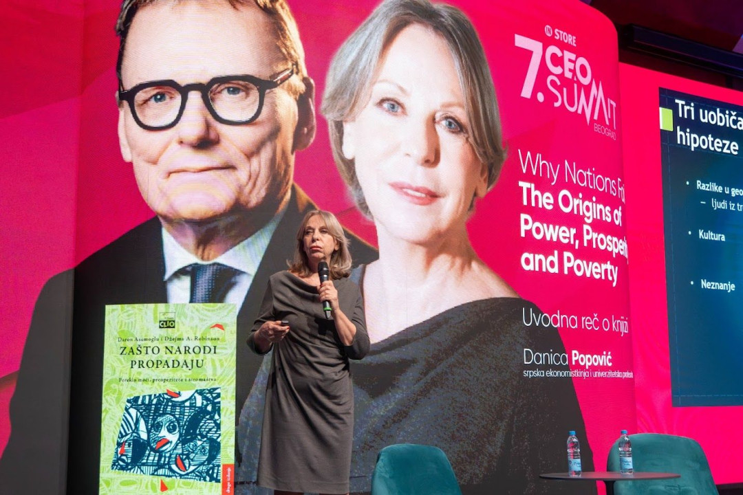 Uvodni govor o knjigi Zakaj narodi propadajo?, je imela pred njegovim predavanjem Danica Popović, profesorica ekonomije na Univerzi v Beogradu.