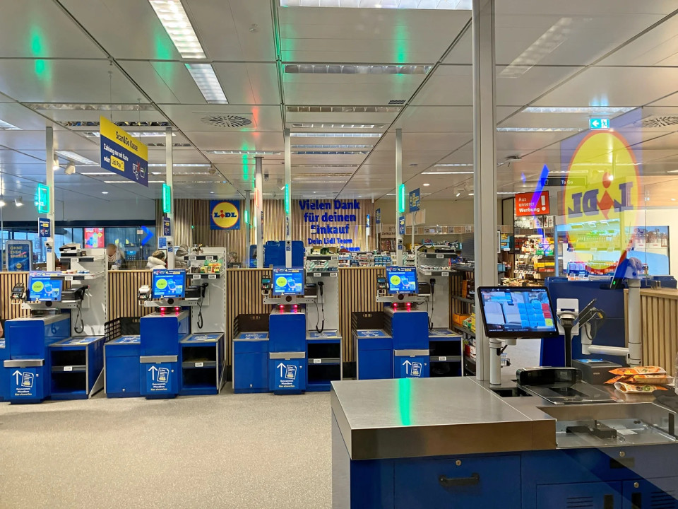 Območje blagajne združuje klasične in tudi samopostrežne blagajne, vključno z Lidlovo novejšo rešitvijo s posebno blagajno za plačila z gotovino, medtem ko kartice in Lidl Pay ostajajo standard na samopostrežnih blagajnah.