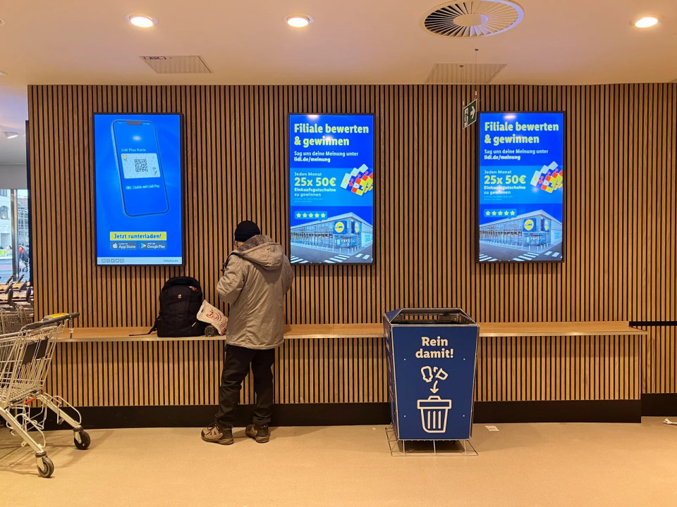 Lidlove najnovejše trgovine v mestu imajo razširjeno digitalno infrastrukturo, z velikimi zasloni, nameščenimi v oknih in takoj za območjem blagajne.