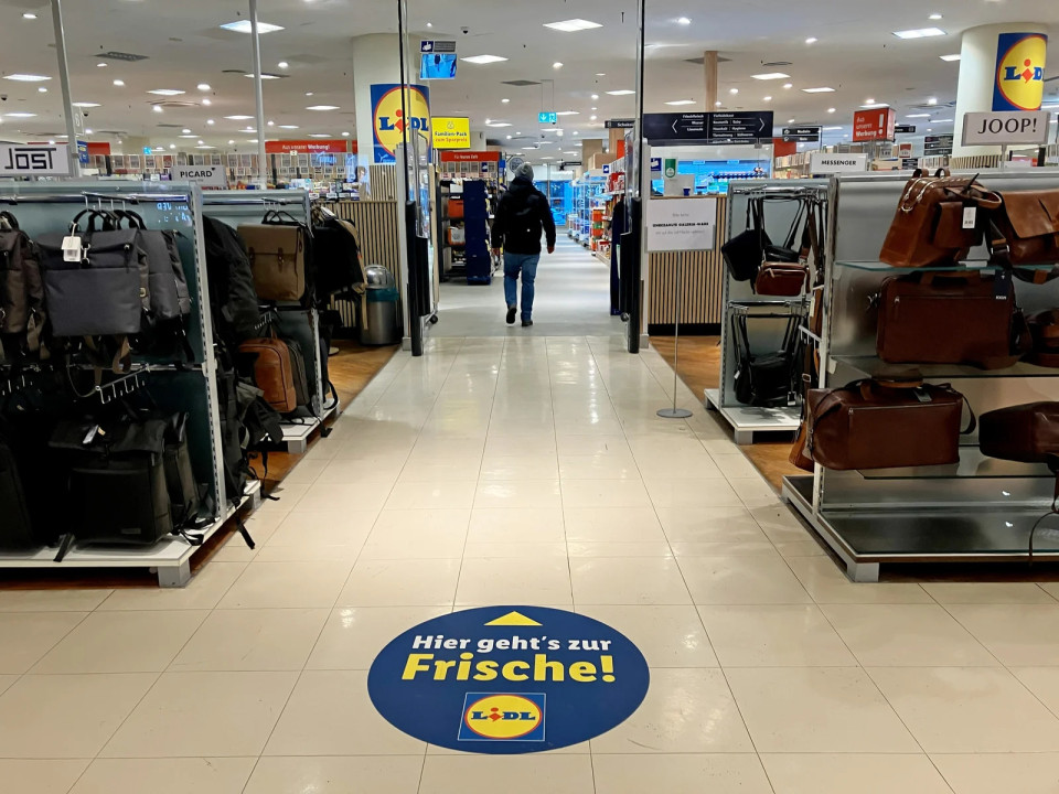 Jasna talna signalizacija vodi stranke skozi veleblagovnico do Lidla. Napis "Hier geht's zur Frische!" ("Tako do sveže hrane!") usmerja tok pešcev proti oddelku s hrano.