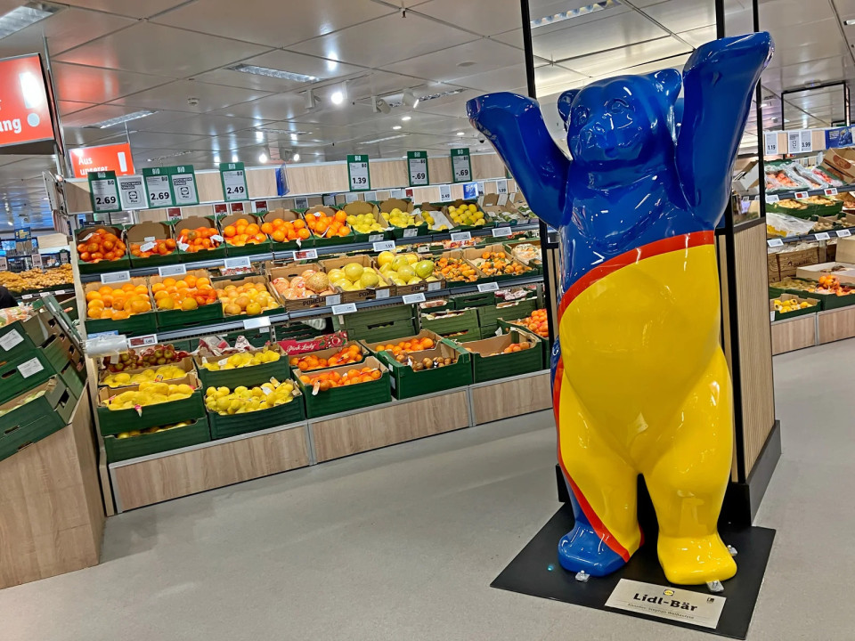 Lidl lokalno "zasidra" trgovino s kombinacijo barv blagovne znamke s kipom medveda, simbolom Berlina.