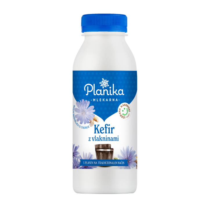 Kefir z vlakninami Mlekarne Planika je fermentiran izdelek iz pasteriziranega nehomogeniziranega mleka z nizko vsebnostjo maščob. Je bogat vir beljakovin. Obogaten je s prehransko vlaknino iz cikorije - inulinom, ki se odlično ujema s kremasto strukturo kefirja in njegovim rahlo kiselkastim okusom. Skupaj ustvarjata prijeten napitek, ki je odlična izbira za osvežujočo malico. Kefir z vlakninami nosi oznako „Izbrana kakovost Slovenija“, ki potrjuje, da je izdelek izdelan po najvišjih standardih.