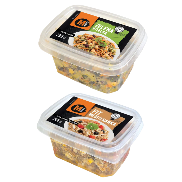 Blagovna znamka Mercator minute je bogatejša za dve hranljivi in okusni solati. Fit mediteranka je polnovredna, hranilno uravnotežena žitna jed iz pire, tune ter pečene rdeče paprike z jajci in črnimi olivami. Za atraktivnost in okusnost zelene vitalke pa poskrbijo tribarvna kvinoja, čičerika, brokoli, bučna semena ter rozine in brusnice. Obe solati predstavljata polnovredna obroka in sta vir beljakovin, zaradi česar sta odlična izbira za hitro malico ali obrok na poti.