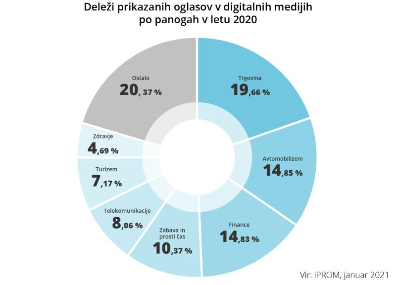 V letu 2020 so bili deleži prikazanih oglasov v digitalnih medijih po panogah razdeljeni podobno kot v 2019. Največji, 19,66-odstotni delež, pripada panogi trgovina, ki je v primerjavi s predlanskim letom in letom 2018 doživela 8,9-odstotno povečanje deleža in tako že četrto leto prevladuje med panogami. Drugi največji delež kljub 12-odstotnemu padcu ohranja panoga avtomobilizem s 14,85 odstotka, tesno ji sledi panoga finance s 14,83-odstotnim deležem prikazanih oglasov.