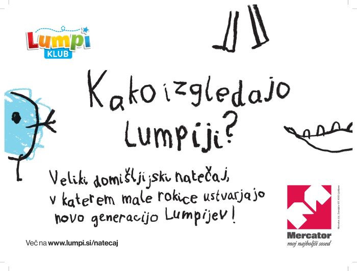 "Izbrali bomo 5 Lumpi likov, njihove avtorje pa nagradili s 1.000 evri. V Mercatorju razumemo mlade družine, pri otrocih pa spodbujamo ustvarjalnost, domišljijski svet, umetniško izražanje ..." je povedala Viktorija Radojević Mavrič, izvršna direktorica področja marketinga in razvoja za Skupino Mercator.