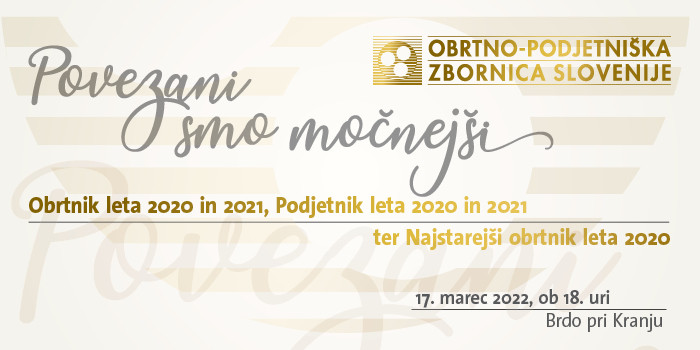 Priznanja bo Obrtno-podjetniška zbornica Slovenije podelila na slovesnosti, ki bo Brdu pri Kranju. Zaradi omejitev v času epidemije, je bil dogodek večkrat prestavljen, zato pa bo tokratna izvedba še bolj slavnostna.