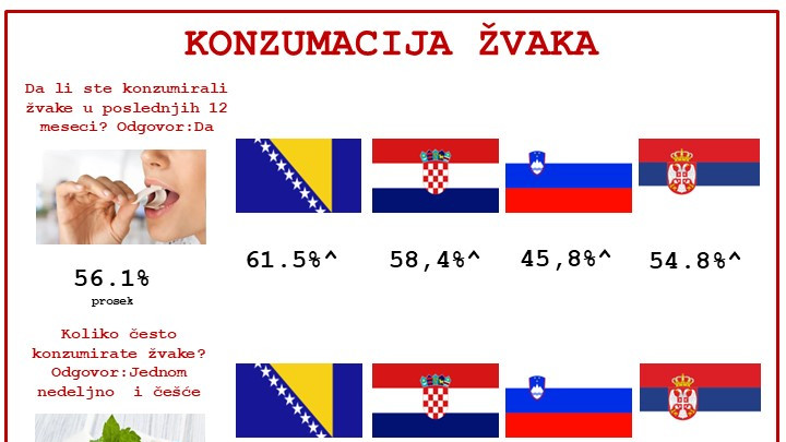 Ovom prilikom, biće prikazan deo podataka iz TGI baze koji se odnosi na konzumaciju žvakaćih guma na tržištima BiH, Hrvatske, Slovenije i Srbije. Osim kategorija žvaka u TGI bazi postoje podaci i za sledeće kategorije iz sektora konditorskih proizvoda: bombonjere, čokoladice, čokolade, čoko dražeje i praline, čokoladni namazi, bombone, keks i čajna peciva, integralni keks, biskviti, napolitanke, štanlice od žitarica, zrnasti proizvodi, čips, flips, krekeri i snek proizvodi.