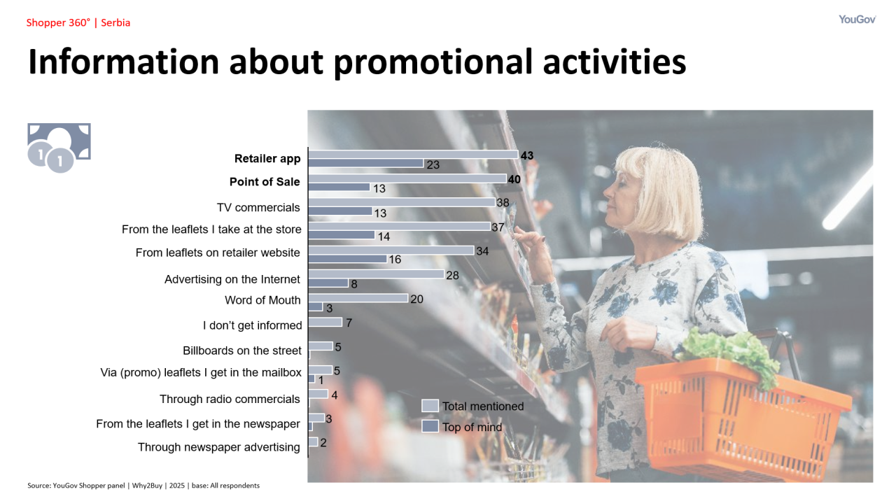Sve ovo pokazuje da POS više nije samo „tačka prodaje“, već pravo mesto odluke. Razumevanje tog trenutka – bilo u fizičkom ili digitalnom okruženju – može značajno uticati na izbor brenda i rezultate prodaje. Kao što istraživanje Shopper 360 pokazuje, kupci se najčešće informišu o promotivnim aktivnostima putem aplikacija i upravo na mestu prodaje (POS).