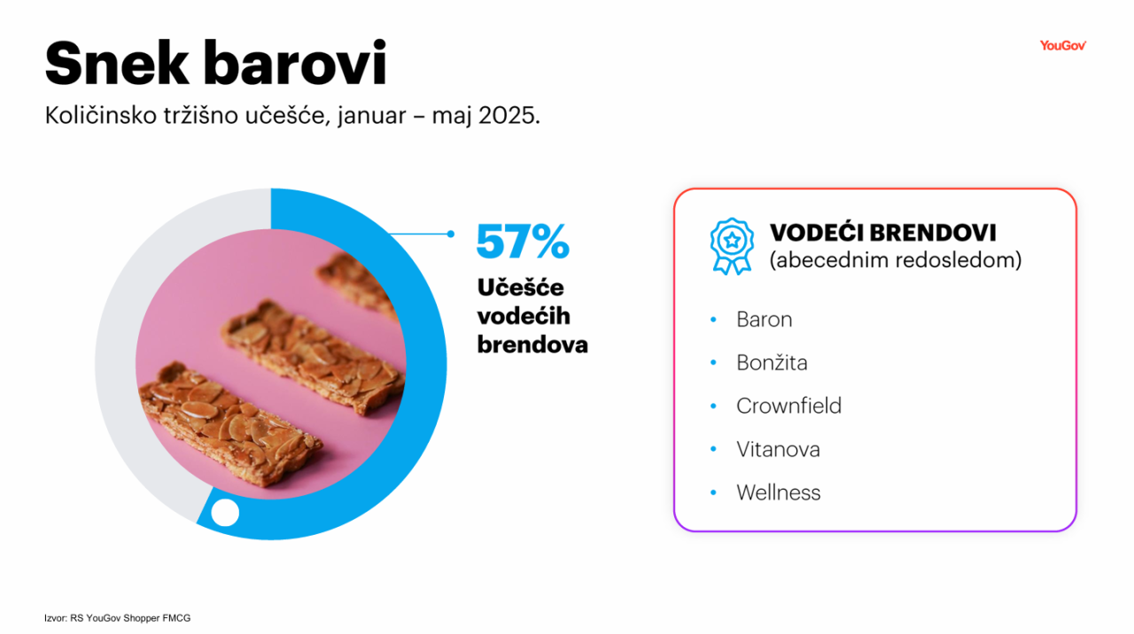 Na posmatranom tržištu, pet vodećih brendova odnosi 57% ukupne kupljene količine snek barova. To su, po abecednom redosledu: Baron, Bonžita, Crownfield, Vitanova i Wellness. Lojalnost brendu lideru iznosi 73%, što znači da od ukupne količine snek barova koju kupci ovog brenda kupe, blizu ¾ čini upravo taj brend. Osim toga, kao brend sa najvećom lojalnošću kupaca, u analiziranoj kategoriji, izdvojio se Baron.