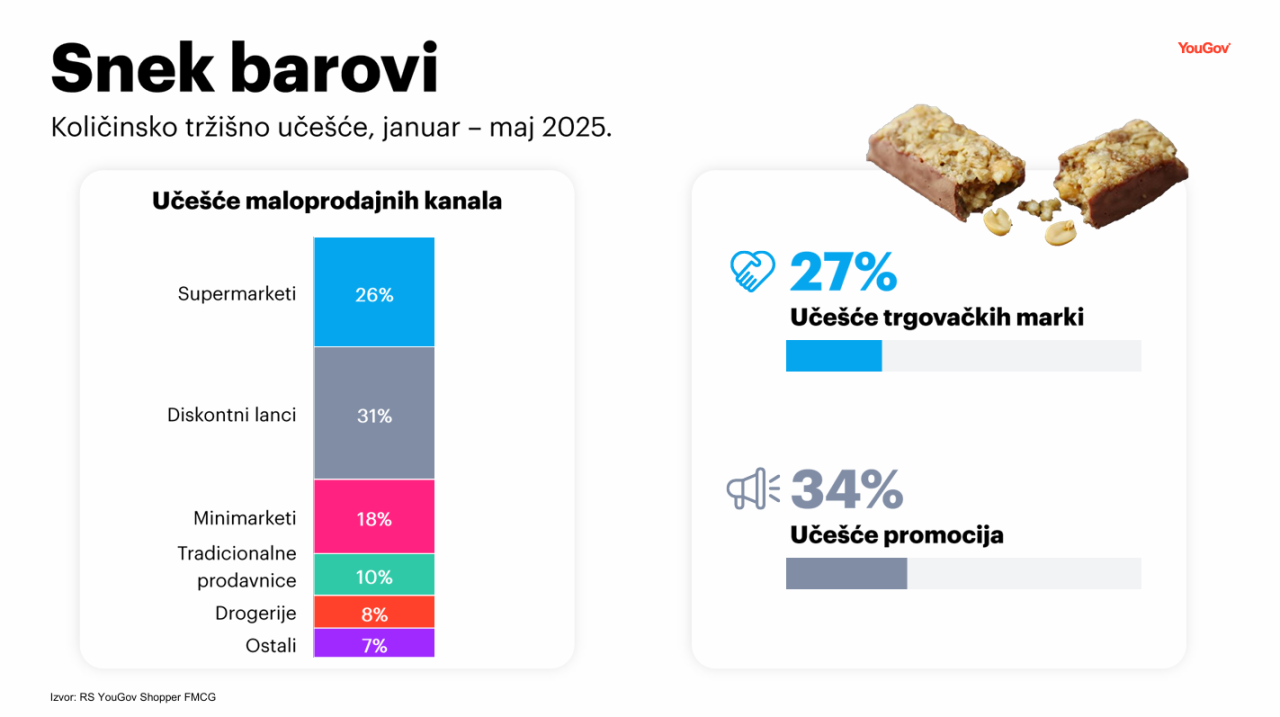 Trgovačke marke su ostvarile rast količinskog učešća, pri čemu ono dostiže 27% u posmatranom periodu. Dodatno, lojalnost navedenim markama iznosi 52%. Snek barovi kupljeni na promociji generišu 34% ukupne kupljene količine kategorije.