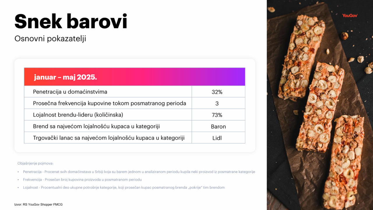 Analizom su obuhvaćene kupovine snek barova u domaćinstvima u Srbiji, u periodu od januara do maja 2025. godine.